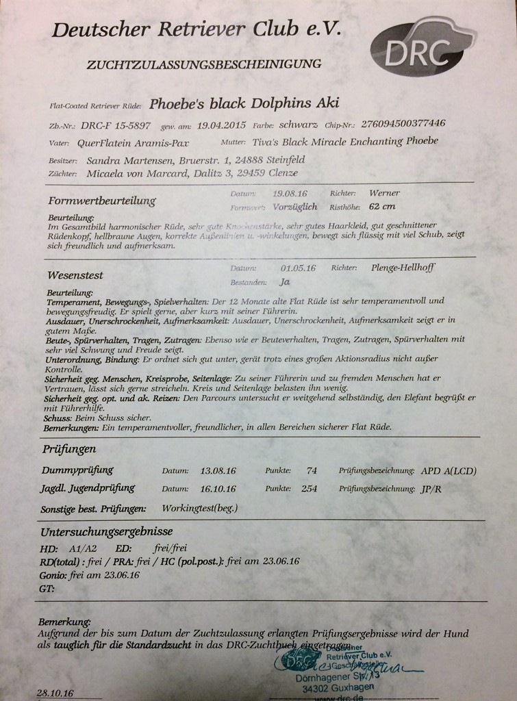 Bemerkungen: Ein temperamentvoller, freundlicher, in allen Bereichen sicherer Flat Rüde.