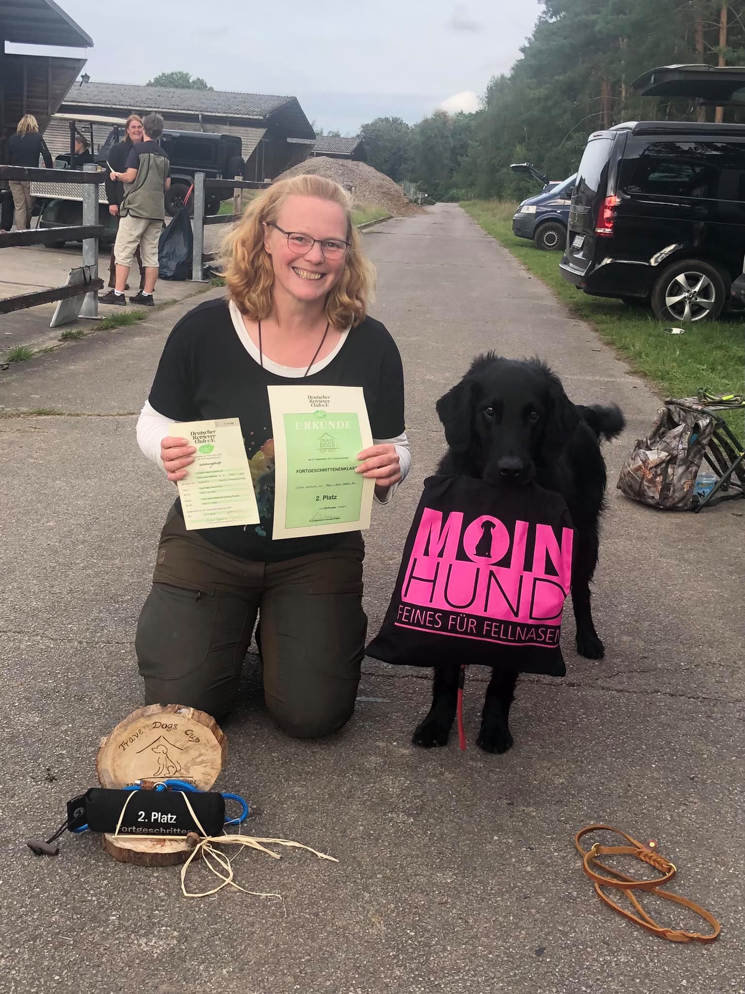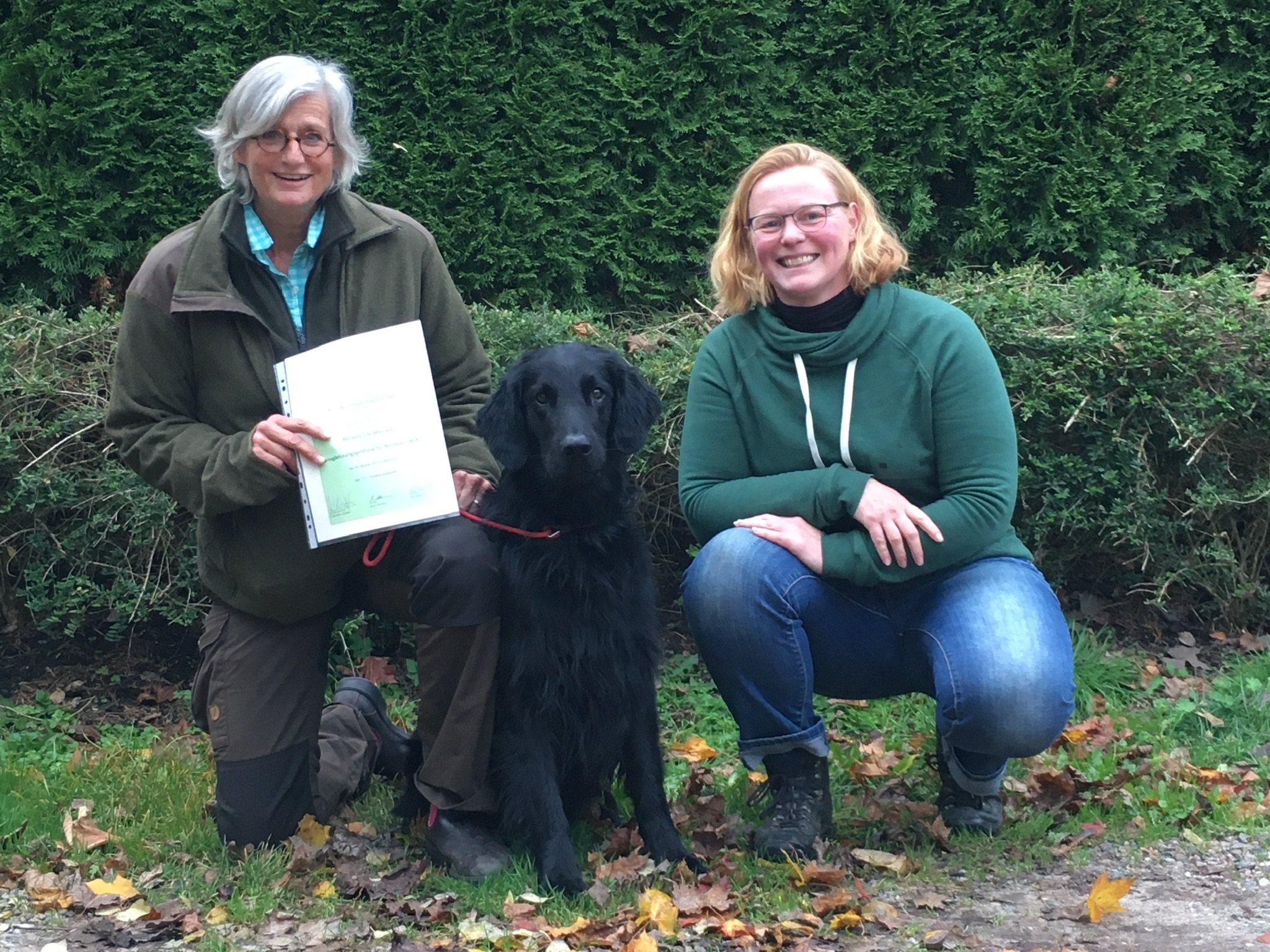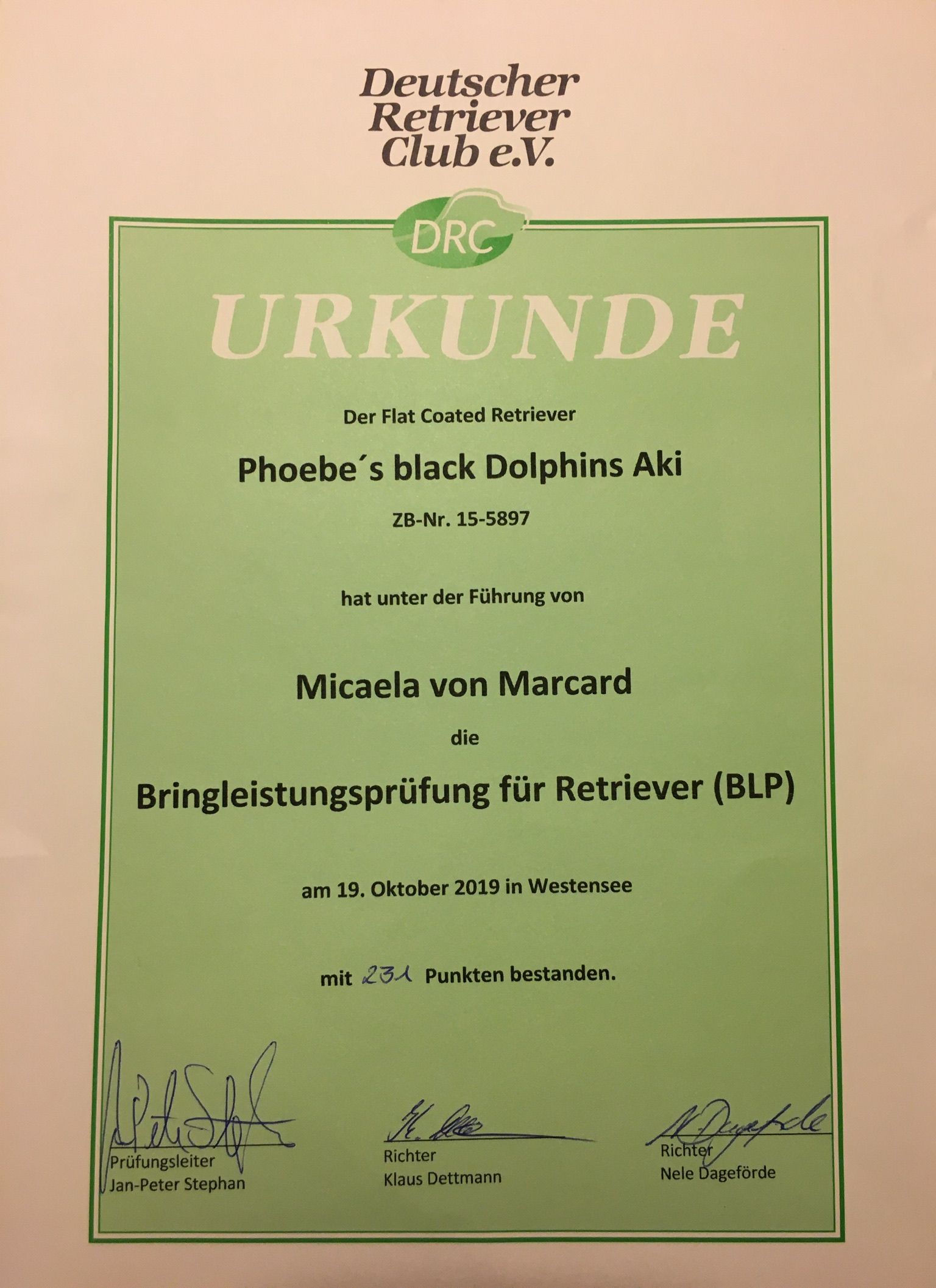 Da ich keinen Jagdschein habe, wurde Aki von seiner Züchterin Micaela von Marcard auf der Prüfung geführt. Nachdem sich beide aneinander gewöhnt hatten (Aki war irritiert, weil ich nicht da war), konnten sie die Prüfung sehr gut bestehen. Somit erhält Aki die Zulassung zur jagdlichen Leistungszucht.