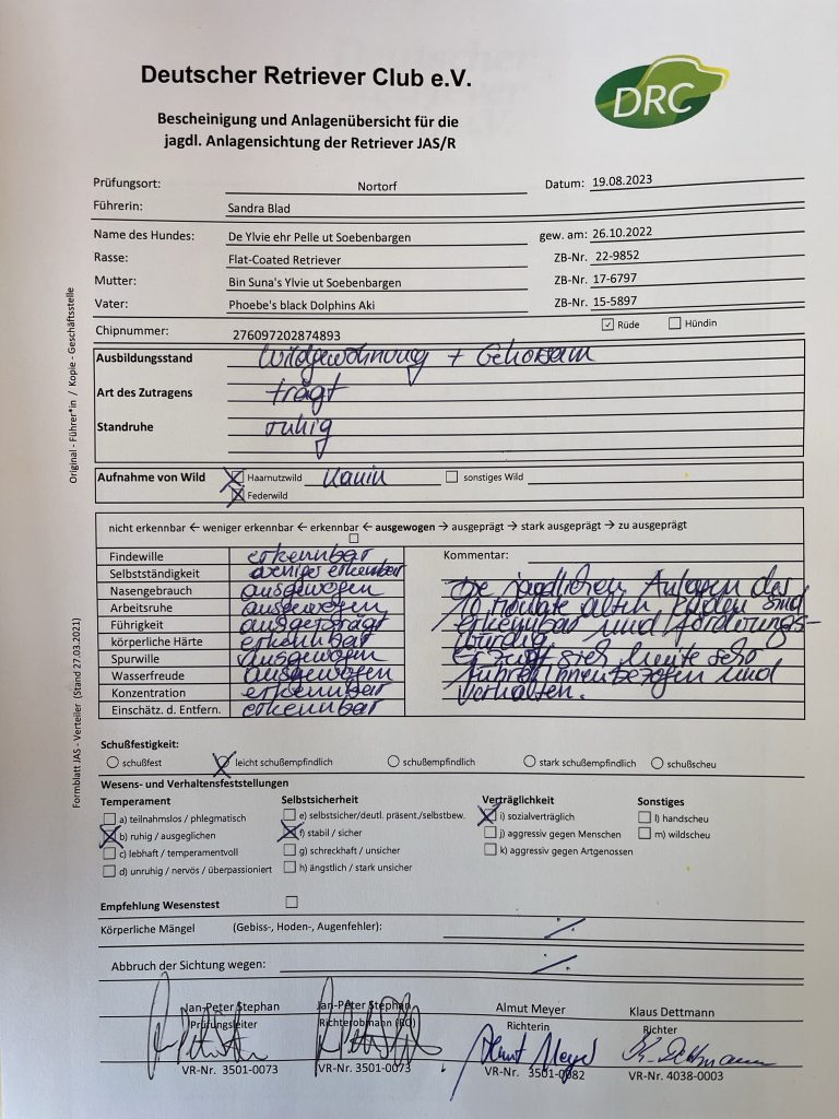 Bei warmen Temperaturen hat Pelle seine Sache gut gemeistert. Ich war froh, dass sich der 8 Monate alte Knirps nicht ganz so selbständig zeigte, wie die Richter es gerne gesehen hätten. Es war unser erster Schritt in Richtung Jagd/Prüfung und da war es mir ganz recht, dass er sich an mir orientiert hat. So kann es weiter gehen!